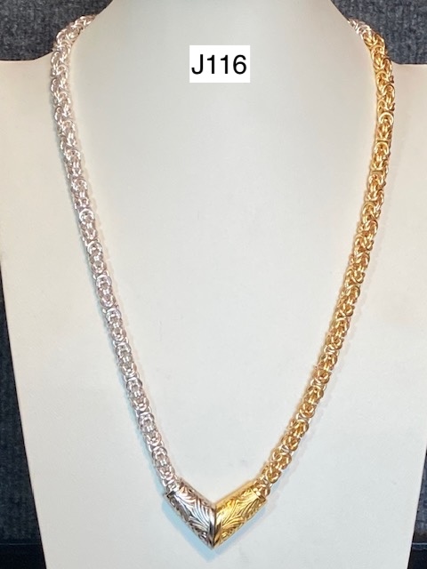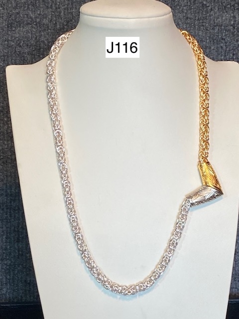 J116) Half silver and half gold colored Byzantine necklace with ornate magnetic front clasp. Clasp may be worn to the side as shown -- Price: $160