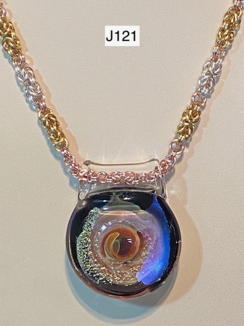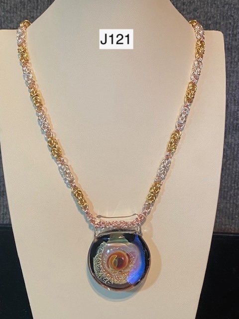 J121) Silver and gold colored Byzantine chain with a small section of rose gold by the one-of-a-kind focal bead of lamp worked glass, magnetic clasp -- Price: $185