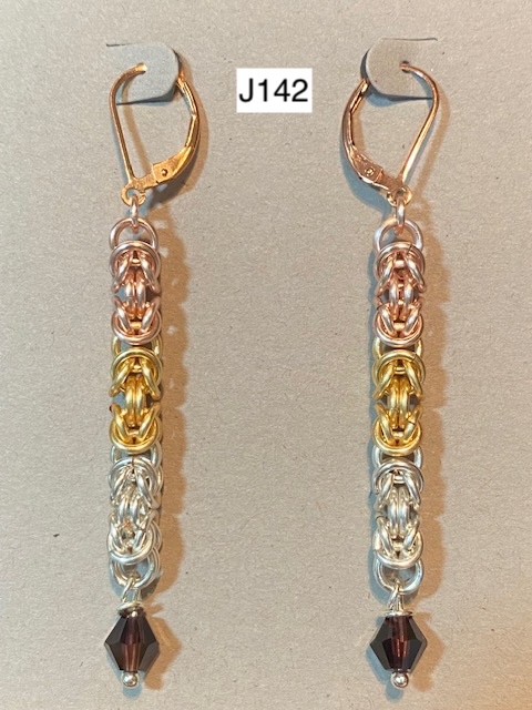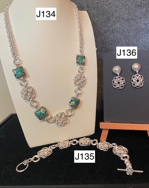 Bev Atseff not only weaves with fibers, but she also weaves with various metal jump rings to create one-of-a-kind chainmaille jewelry pieces. Each ring is opened with pliers, woven into a pattern, and closed. Bev works with various colored rings made of aluminum, brass, and copper, as well as sterling silver. Prices are determined based on the metals used and the time needed to create the piece. Bev enhances some of the designs with beads, crystals, pearls, and pieces by other American glass artists.