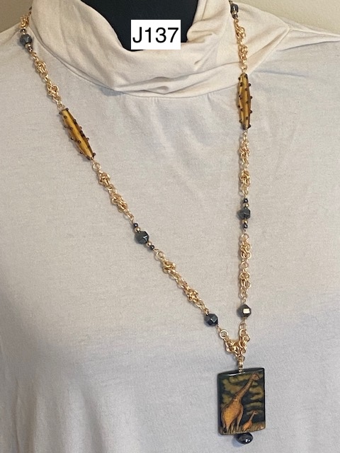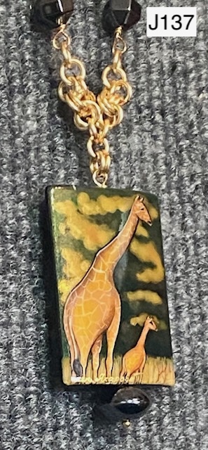 J137) Chinese Knot Giraffe Necklace with gold colored chainmail featuring a hand-painted giraffe on agate and two "giraffe looking" specialty beads as well as gold and gun metal beads, 28" long slip on necklace (no clasp) -- Price: $185
