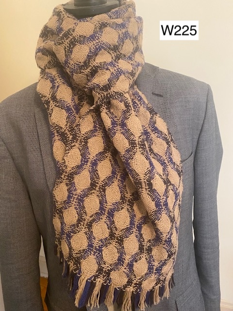 W225) Shetland wool scarf in beige with black and blue, two sided design (12" x 72"), hand wash very gently or dry clean -- Price: $l60