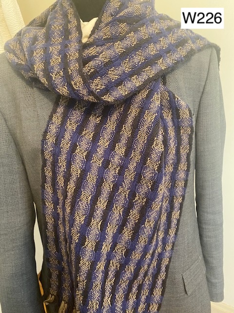 W226) Shetland wool scarf in blue and black with beige, two sided design (12" x 72"), hand wash very gently or dry clean -- Price: $l60