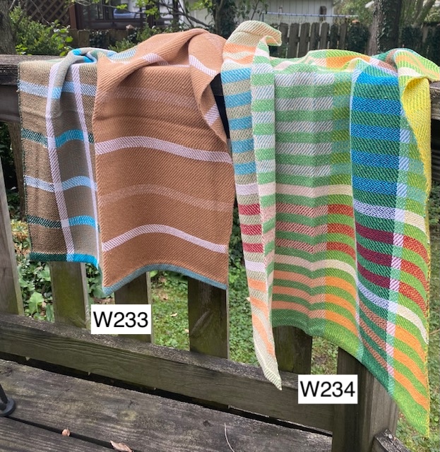 ____________________________________________________________________________________________________W154-W157) Linen towels with white, light orange, dark orange, and brown stripes. Machine wash and dry, press if needed. -- Price: $35